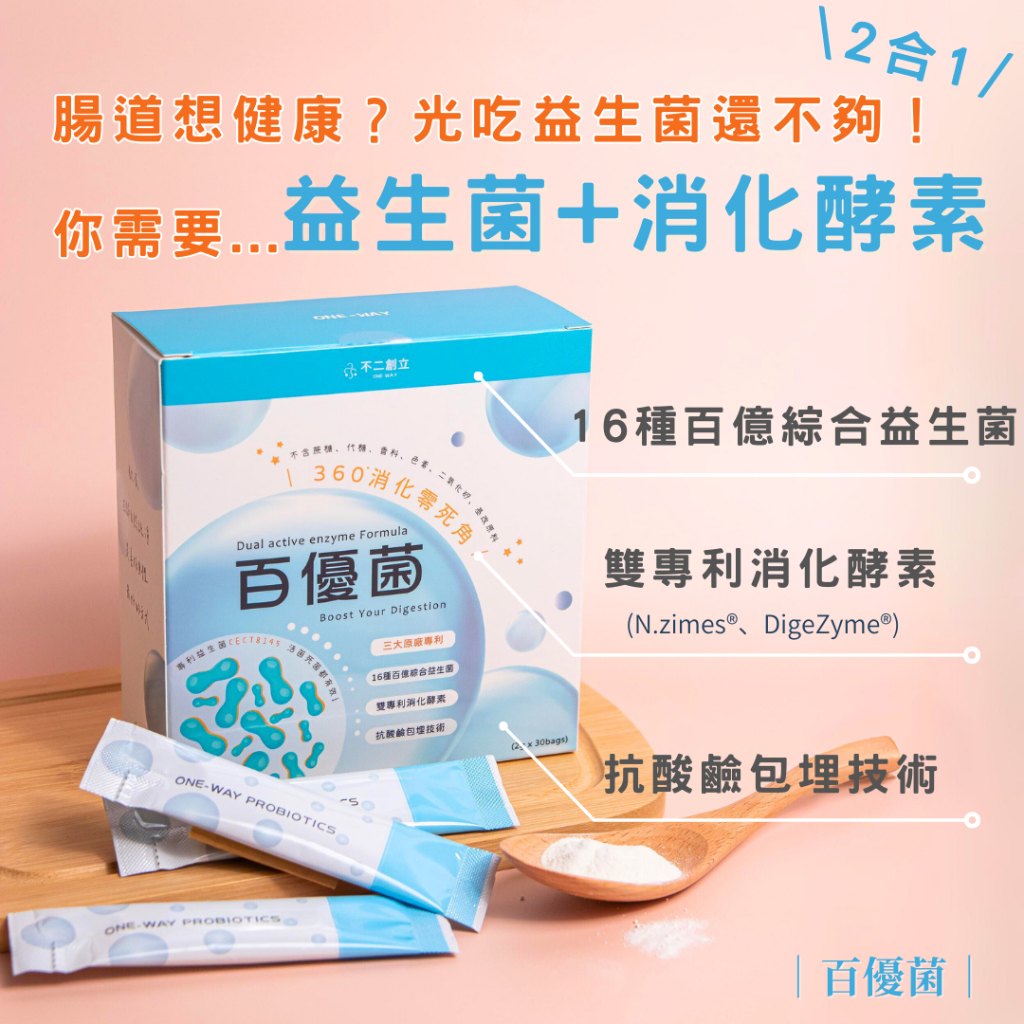 What the 百優菌 formula covers (enzymes + probiotics + prebiotics)